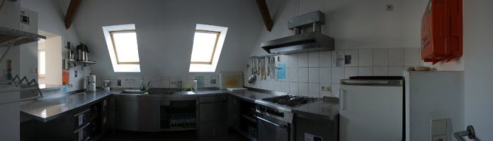 Die Küche in St. Clara liegt im Dachgeschoss gleich neben dem großzügigen Saal, der sich als Speisesaal anbietet und ist, wie alle Küchen im Baden-Powell-Haus, großzügig ausgestattet mit Töpfen, Pfannen, Brätern, Schüsseln, Sieben und vielem mehr. Neben einer Industriespülmaschine gibt es einen vierflammigen Gasherd zum Kochen und einen elektrisch betriebenen Backofen.