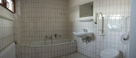 Unter der Treppe befindet sich im Erdgeschoss der hausseitige Eingang zu dem Bad, dass auch die Benutzer des Außengeländes verwenden können. In diesem Bad befindet sich ein Waschbecken, eine behindertengerechte Toilette mit Stützklappgriff und eine Badewanne. Benutzer des Hausteils St. Georg können dieses Bad in Absprache mit den Nutzern des Außengeländes benutzen.