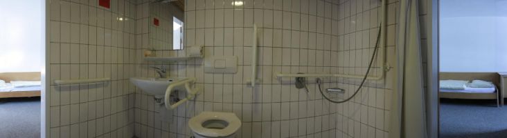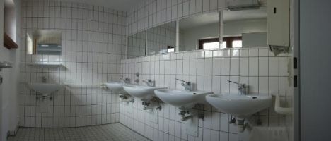 Zusätzlich zu den Waschgelegenheiten der Schlafräume befinden sich Im Eingangsbereich von St. Georg jeweils eine Damen- und Herrentoilette. Im 1. Obergeschoss am Treppenabgang befindet sich ein weiterer Waschraum mit fünf Waschbecken.